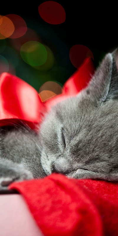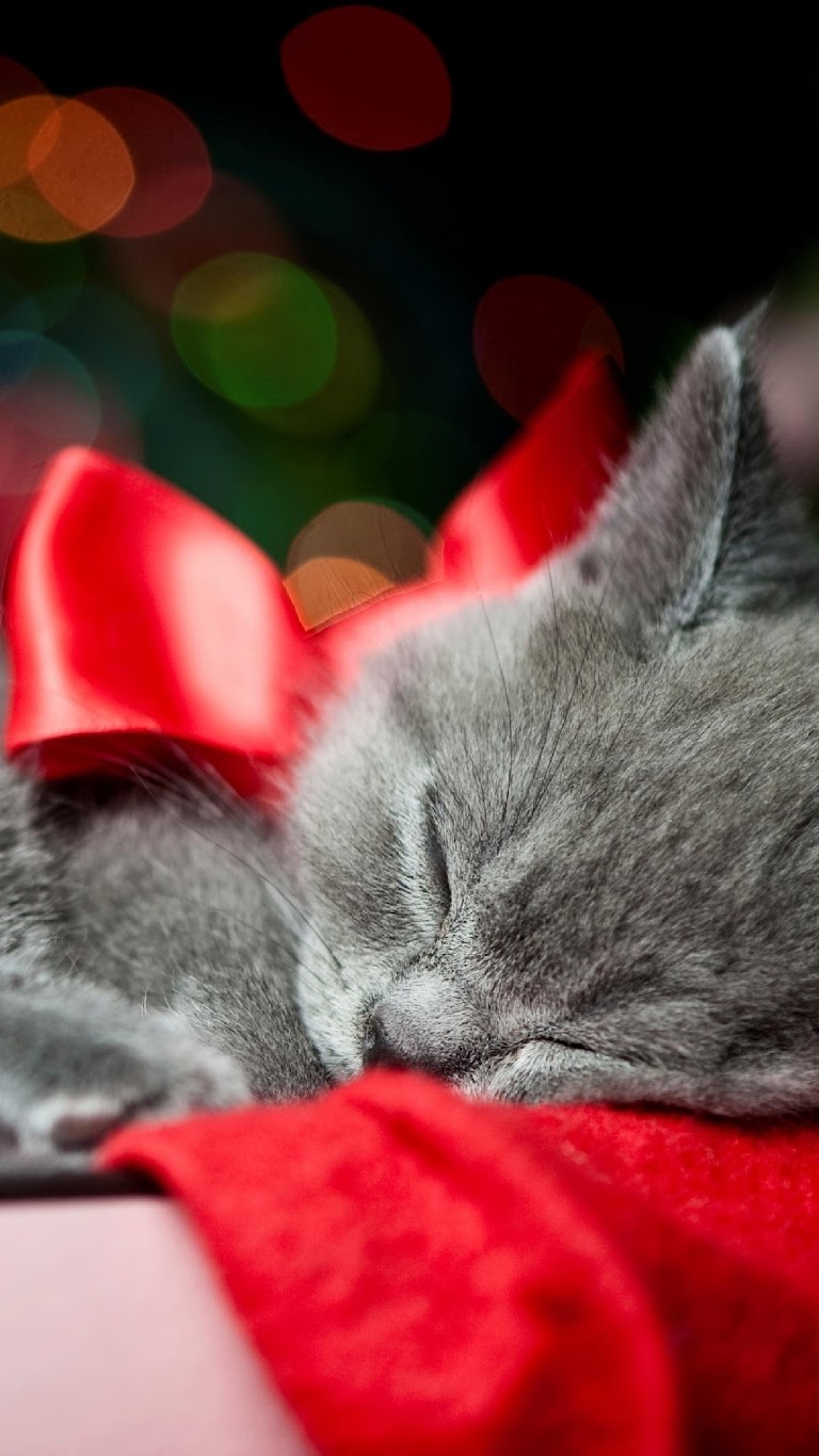 Click here to download 400x800 pixel Grey Kitten Red Ribbon Christmas Present Bokeh Galaxy Note HD Wallpaper